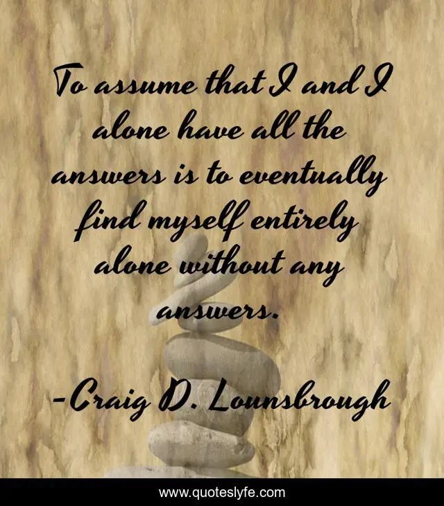 This page presents the quote "To assume that I and I alone have all the answers is to eventually find myself entirely alone without any answers.". Author of this quote is Craig D. Lounsbrough. This quote is about selfish, misdirected, prideful, assume, ignorance, answers, arrogance, cures, ignorant,.