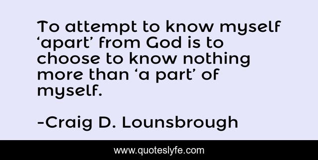 This page presents the quote "To attempt to know myself ‘apart’ from God is to choose to know nothing more than ‘a part’ of myself.". Author of this quote is Craig D. Lounsbrough. This quote is about jesus-christ, knowing, introspection, self-awareness, god, ignorance, christianity, introspective, ignorant,.