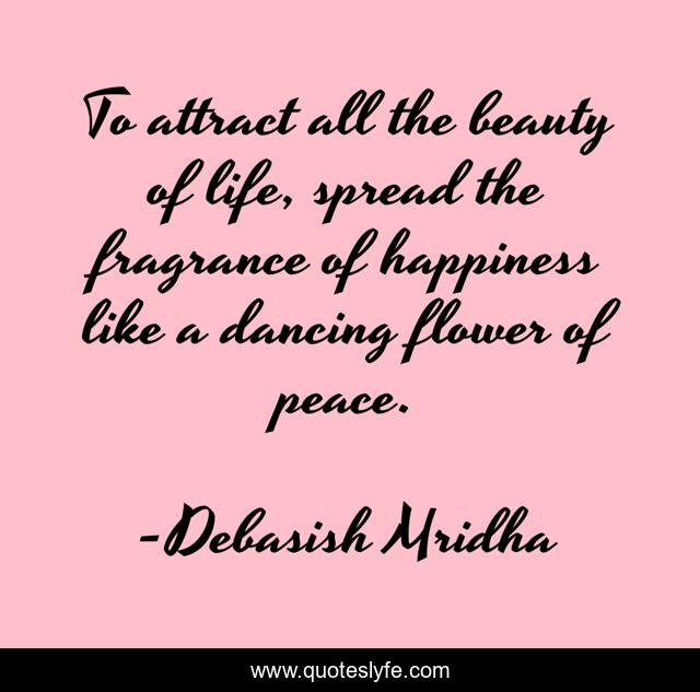 This page presents the quote "To attract all the beauty of life, spread the fragrance of happiness like a dancing flower of peace.". Author of this quote is Debasish Mridha. This quote is about peace, philosophy, debasish-mridha, flower-of-peace, quotes, inspirational, enthusiasm, beauty-of-life, debasish-mridha-m-d,.