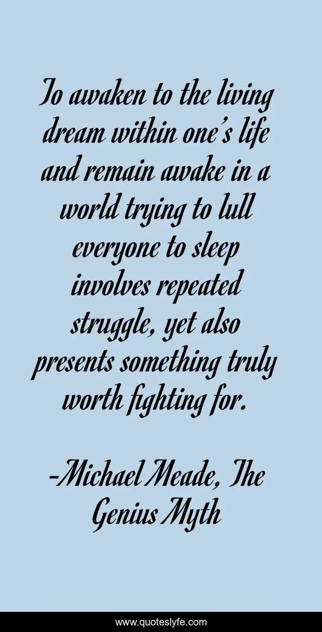 This page presents the quote "To awaken to the living dream within one’s life and remain awake in a world trying to lull everyone to sleep involves repeated struggle, yet also presents something truly worth fighting for.". Author of this quote is Michael Meade, The Genius Myth. This quote is about awakening, struggle, presence,.