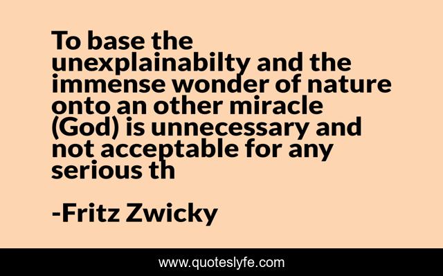This page presents the quote "To base the unexplainabilty and the immense wonder of nature onto an other miracle (God) is unnecessary and not acceptable for any serious th". Author of this quote is Fritz Zwicky. This quote is about science-vs-religion, god-of-the-gaps, thinking, science, nature, unnecessary, miracle, unexplainable, serious,.