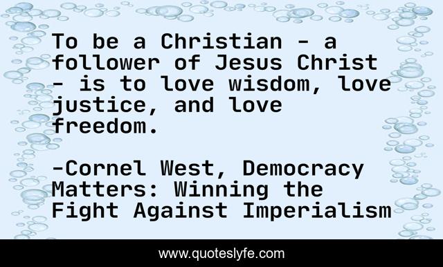 This page presents the quote "To be a Christian - a follower of Jesus Christ - is to love wisdom, love justice, and love freedom.". Author of this quote is Cornel West, Democracy Matters: Winning the Fight Against Imperialism. This quote is about christian, christ, justice, freedom, wisdom, spirituality, love, affection,.