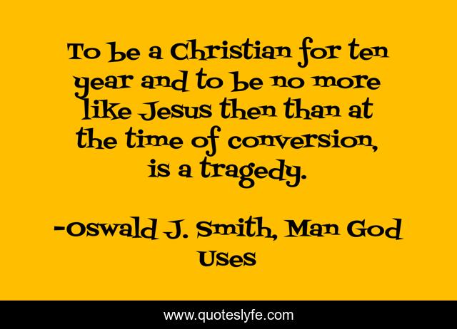 This page presents the quote "To be a Christian for ten year and to be no more like Jesus then than at the time of conversion, is a tragedy.". Author of this quote is Oswald J. Smith, Man God Uses. This quote is about christian-life, spiritual,.