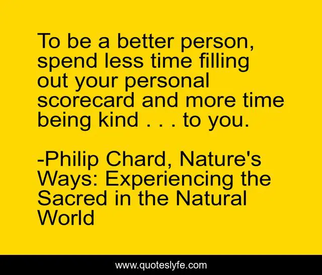 This page presents the quote "To be a better person, spend less time filling out your personal scorecard and more time being kind . . . to you.". Author of this quote is Philip Chard, Nature's Ways: Experiencing the Sacred in the Natural World. This quote is about kindness, healing, self-compassion,.