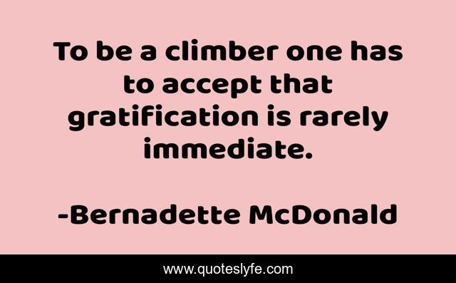 This page presents the quote "To be a climber one has to accept that gratification is rarely immediate.". Author of this quote is Bernadette McDonald. This quote is about rock-climbing, rock-climbing-qoutes, wisdom, gratification, climbing, mountaineering, freedom-climbers,.