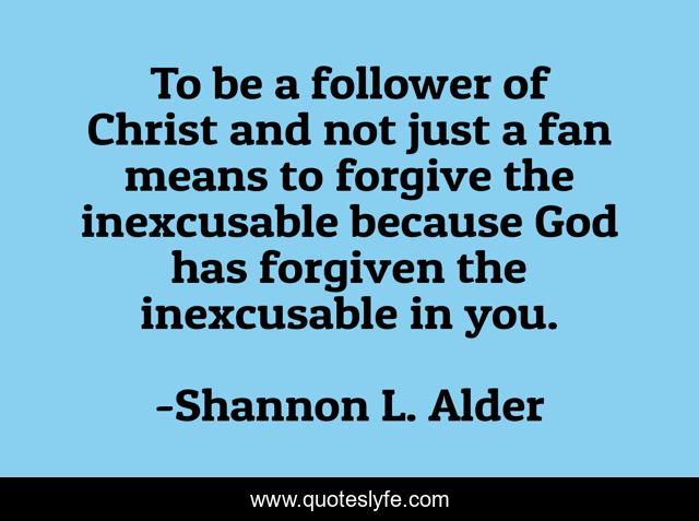 This page presents the quote "To be a follower of Christ and not just a fan means to forgive the inexcusable because God has forgiven the inexcusable in you.". Author of this quote is Shannon L. Alder. This quote is about forgiveness, christianity,.