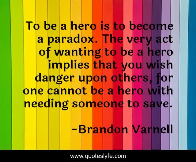 This page presents the quote "To be a hero is to become a paradox. The very act of wanting to be a hero implies that you wish danger upon others, for one cannot be a hero with needing someone to save.". Author of this quote is Brandon Varnell. This quote is about dark, realistic,.