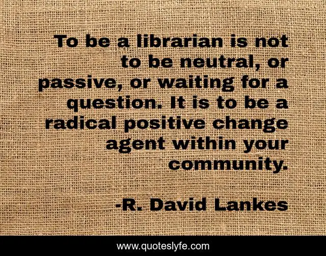 This page presents the quote "To be a librarian is not to be neutral, or passive, or waiting for a question. It is to be a radical positive change agent within your community.". Author of this quote is R. David Lankes. This quote is about libraries, librarians, change, community,.