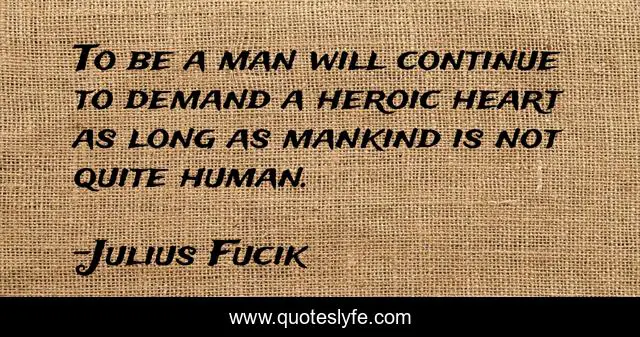 This page presents the quote "To be a man will continue to demand a heroic heart as long as mankind is not quite human.". Author of this quote is Julius Fucik. .
