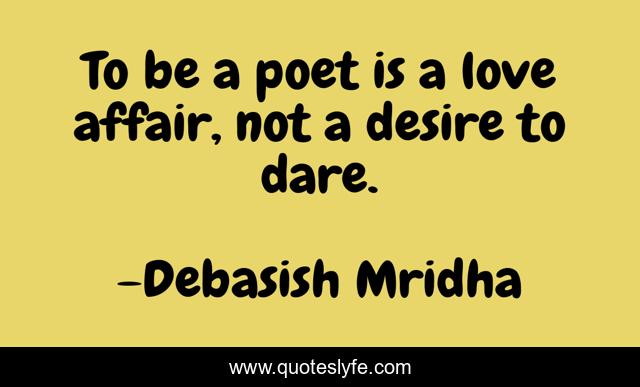 This page presents the quote "To be a poet is a love affair, not a desire to dare.". Author of this quote is Debasish Mridha. This quote is about desire, affair, life, love, knowledge, inspirational, intelligence, philosophy, affection,.
