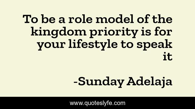 This page presents the quote "To be a role model of the kingdom priority is for your lifestyle to speak it". Author of this quote is Sunday Adelaja. This quote is about kingdom, lifestyle, priority, role, model, speak,.