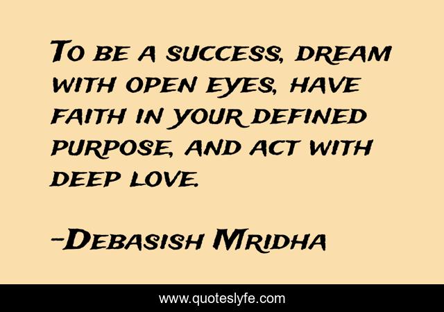 This page presents the quote "To be a success, dream with open eyes, have faith in your defined purpose, and act with deep love.". Author of this quote is Debasish Mridha. This quote is about faith, love, how-to-be-a-success, success, philosophy, debasish-mridha, quotes, purpose, inspirational,.