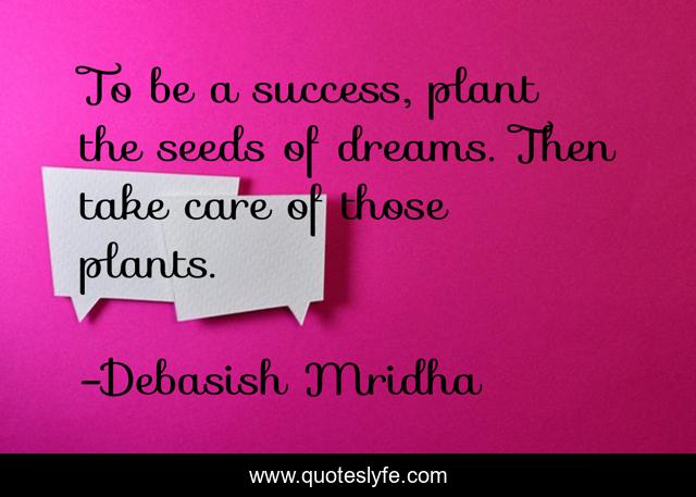 This page presents the quote "To be a success, plant the seeds of dreams. Then take care of those plants.". Author of this quote is Debasish Mridha. This quote is about miraboli, how-to-be-a-success, oscar-wilde, philosophy, debasish-mridha, plant-the-seeds-of-dreams, quotes, buddha, debasish-mridha-md,.
