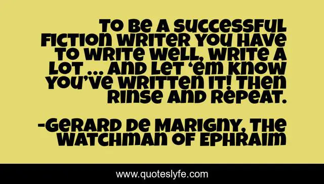 This page presents the quote "To be a successful fiction writer you have to write well, write a lot … and let ‘em know you’ve written it! Then rinse and repeat.". Author of this quote is Gerard de Marigny, The Watchman of Ephraim. This quote is about writing-as-a-profession, writing-advice, writing, inspirational, enthusiasm, self-publishing,.