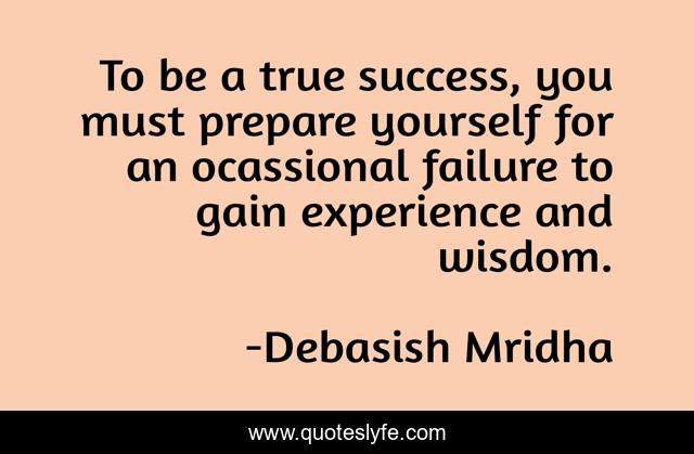 This page presents the quote "To be a true success, you must prepare yourself for an ocassional failure to gain experience and wisdom.". Author of this quote is Debasish Mridha. This quote is about debasish, debasish-mridha, philosophy, gain-experience-and-wisdom, mridha, true-success, occasional-failure,.