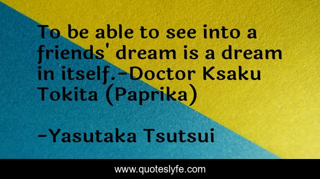 This page presents the quote "To be able to see into a friends' dream is a dream in itself.-Doctor Kōsaku Tokita (Paprika)". Author of this quote is Yasutaka Tsutsui. This quote is about friend, science, tsutsui, yasutaka, blaze, lover, saotome, dreams,.