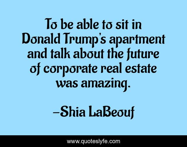 This page presents the quote "To be able to sit in Donald Trump's apartment and talk about the future of corporate real estate was amazing.". Author of this quote is Shia LaBeouf. This quote is about real, future, real estate,.