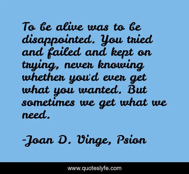 This page presents the quote "To be alive was to be disappointed. You tried and failed and kept on trying, never knowing whether you'd ever get what you wanted. But sometimes we get what we need.". Author of this quote is Joan D. Vinge, Psion. This quote is about effort, disappointment,.