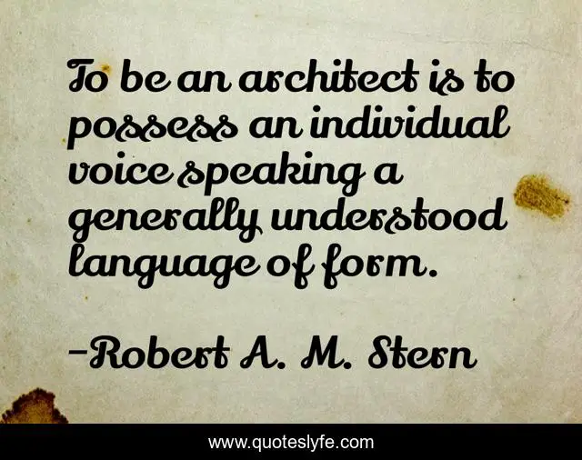 This page presents the quote "To be an architect is to possess an individual voice speaking a generally understood language of form.". Author of this quote is Robert A. M. Stern. This quote is about architecture, architects,.