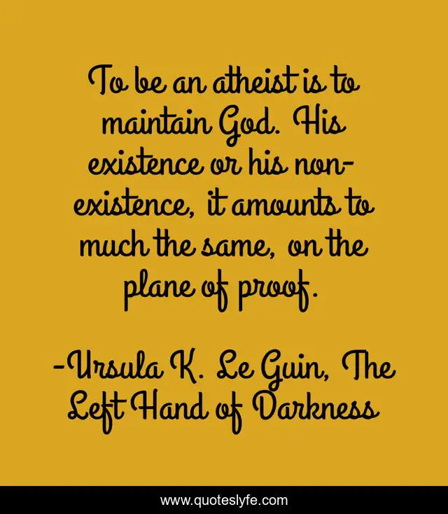 This page presents the quote "To be an atheist is to maintain God. His existence or his non-existence, it amounts to much the same, on the plane of proof.". Author of this quote is Ursula K. Le Guin, The Left Hand of Darkness. This quote is about atheism, god, religion, science-fiction, spirituality,.