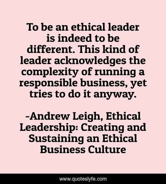 This page presents the quote "To be an ethical leader is indeed to be different. This kind of leader acknowledges the complexity of running a responsible business, yet tries to do it anyway.". Author of this quote is Andrew Leigh, Ethical Leadership: Creating and Sustaining an Ethical Business Culture. This quote is about ethical-behavior, business, andrew-leigh, ethical-leadership, leadership, nonfiction, ethics, business-culture,.
