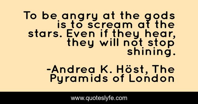 This page presents the quote "To be angry at the gods is to scream at the stars. Even if they hear, they will not stop shining.". Author of this quote is Andrea K. Höst, The Pyramids of London. This quote is about gods, fate, stars,.