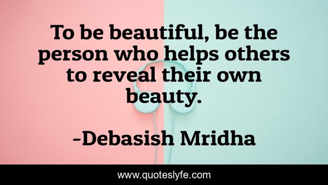 This page presents the quote "To be beautiful, be the person who helps others to reveal their own beauty.". Author of this quote is Debasish Mridha. This quote is about beautiful, reveal-beauty, inspirational, philosophy, debasish-mridha, help-others, quotes, to-be-beautiful, enthusiasm,.