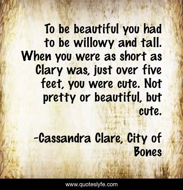 This page presents the quote "To be beautiful you had to be willowy and tall. When you were as short as Clary was, just over five feet, you were cute. Not pretty or beautiful, but cute.". Author of this quote is Cassandra Clare, City of Bones. .