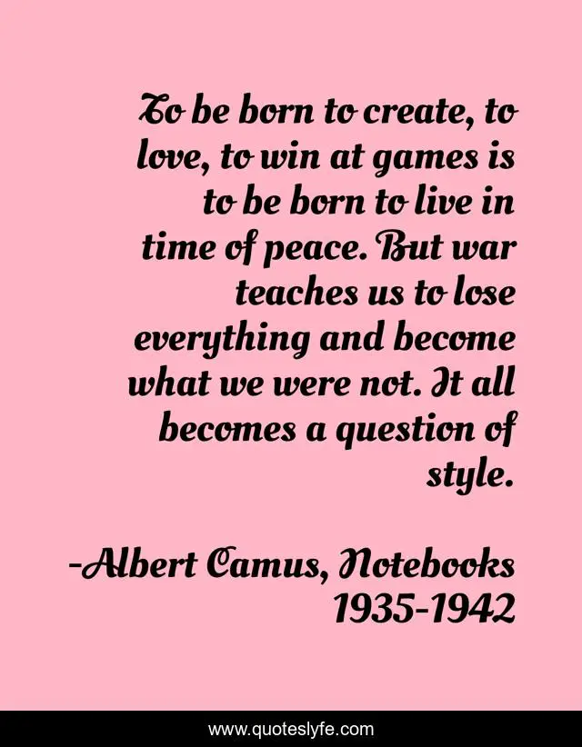 This page presents the quote "To be born to create, to love, to win at games is to be born to live in time of peace. But war teaches us to lose everything and become what we were not. It all becomes a question of style.". Author of this quote is Albert Camus, Notebooks 1935-1942. This quote is about peace, war,.