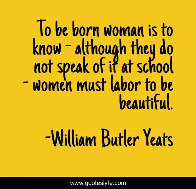 This page presents the quote "To be born woman is to know - although they do not speak of it at school - women must labor to be beautiful.". Author of this quote is William Butler Yeats. This quote is about beautiful, school, woman,.
