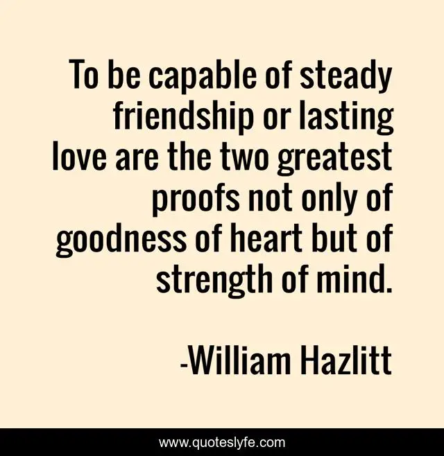 This page presents the quote "To be capable of steady friendship or lasting love are the two greatest proofs not only of goodness of heart but of strength of mind.". Author of this quote is William Hazlitt. .