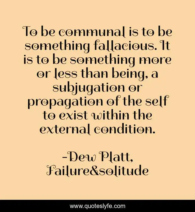 This page presents the quote "To be communal is to be something fallacious. It is to be something more or less than being, a subjugation or propagation of the self to exist within the external condition.". Author of this quote is Dew Platt, Failure&solitude. This quote is about dew-platt, inspiration,.