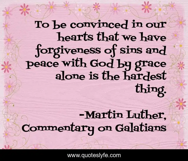 This page presents the quote "To be convinced in our hearts that we have forgiveness of sins and peace with God by grace alone is the hardest thing.". Author of this quote is Martin Luther, Commentary on Galatians. This quote is about god, forgiveness, grace,.