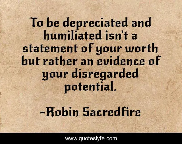 This page presents the quote "To be depreciated and humiliated isn't a statement of your worth but rather an evidence of your disregarded potential.". Author of this quote is Robin Sacredfire. This quote is about confidence, positive, motivational, arte, optimistic, inspirational, enthusiasm,.