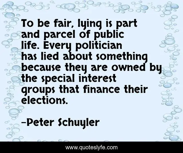 This page presents the quote "To be fair, lying is part and parcel of public life. Every politician has lied about something because they are owned by the special interest groups that finance their elections.". Author of this quote is Peter Schuyler. This quote is about life, special, lying,.