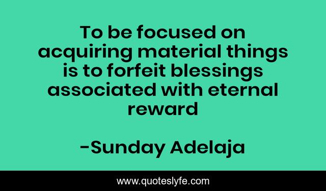 This page presents the quote "To be focused on acquiring material things is to forfeit blessings associated with eternal reward". Author of this quote is Sunday Adelaja. This quote is about blessing, material, eternal, reward,.