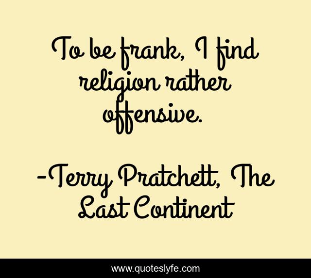 This page presents the quote "To be frank, I find religion rather offensive.". Author of this quote is Terry Pratchett, The Last Continent. .
