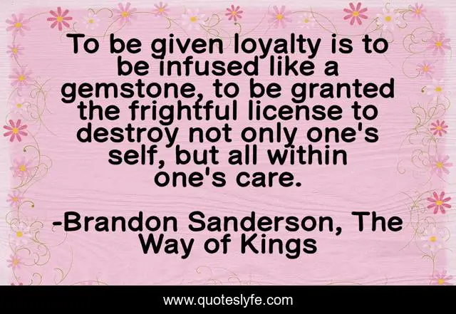 This page presents the quote "To be given loyalty is to be infused like a gemstone, to be granted the frightful license to destroy not only one's self, but all within one's care.". Author of this quote is Brandon Sanderson, The Way of Kings. This quote is about leadership, loyalty,.