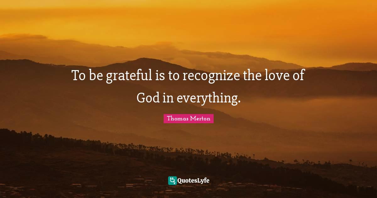 This page presents the quote "To be grateful is to recognize the love of God in everything.". Author of this quote is Thomas Merton. This quote is about love, gratitude, be grateful, thanksgiving, god, grateful,.