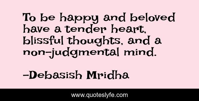 This page presents the quote "To be happy and beloved have a tender heart, blissful thoughts, and a non-judgmental mind.". Author of this quote is Debasish Mridha. This quote is about heart, life, non-judgmental, love, truth, happiness, happy, intelligence, philosophy,.