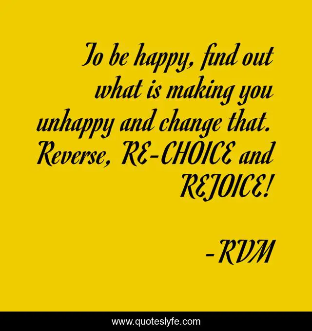 This page presents the quote "To be happy, find out what is making you unhappy and change that. Reverse, RE-CHOICE and REJOICE!". Author of this quote is RVM. This quote is about motivation, inspiration,.