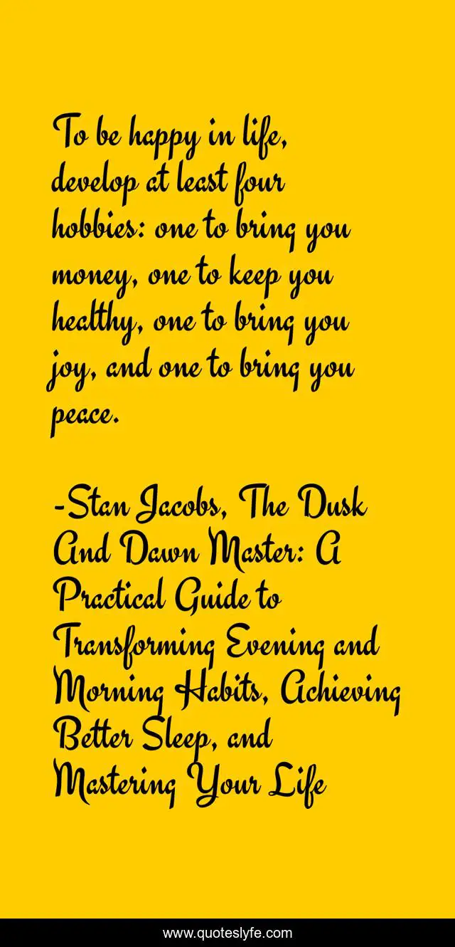 This page presents the quote "To be happy in life, develop at least four hobbies: one to bring you money, one to keep you healthy, one to bring you joy, and one to bring you peace.". Author of this quote is Stan Jacobs, The Dusk And Dawn Master: A Practical Guide to Transforming Evening and Morning Habits, Achieving Better Sleep, and Mastering Your Life. This quote is about passions, joy, dreams, hobbies, enthusiasm, happiness,.