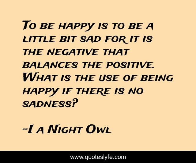This page presents the quote "To be happy is to be a little bit sad for it is the negative that balances the positive. What is the use of being happy if there is no sadness?". Author of this quote is I a Night Owl. This quote is about happiness, yin-and-yang,.