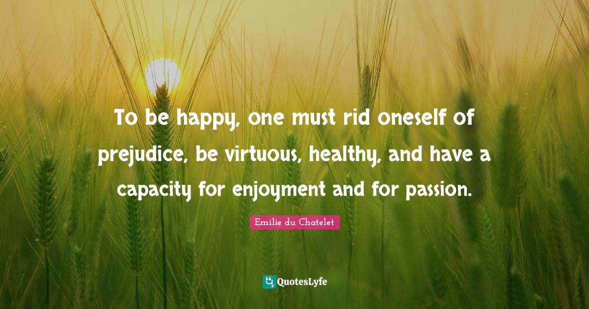 This page presents the quote "To be happy, one must rid oneself of prejudice, be virtuous, healthy, and have a capacity for enjoyment and for passion.". Author of this quote is Emilie du Chatelet. This quote is about capacity, passion, prejudice, virtuous, oneself, happiness, healthy, happy, enjoyment,.