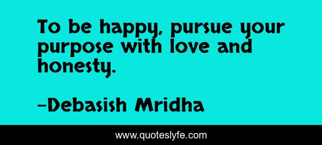 This page presents the quote "To be happy, pursue your purpose with love and honesty.". Author of this quote is Debasish Mridha. This quote is about life, love, knowledge, inspirational, intelligence, philosophy, wisdom, quotes, affection,.