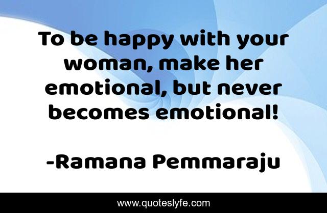 This page presents the quote "To be happy with your woman, make her emotional, but never becomes emotional!". Author of this quote is Ramana Pemmaraju. This quote is about woman, love, happpy-life, emotional-freedom, affection, man,.