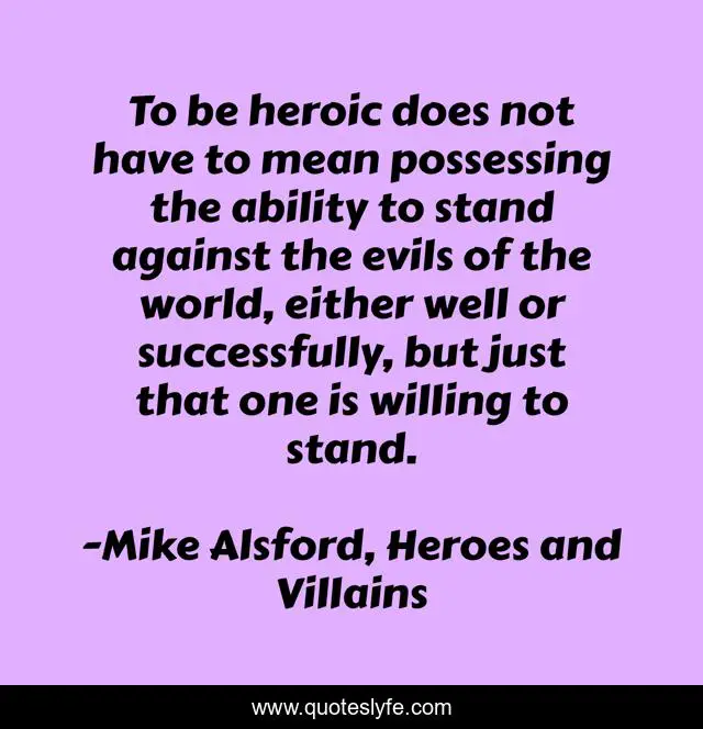 This page presents the quote "To be heroic does not have to mean possessing the ability to stand against the evils of the world, either well or successfully, but just that one is willing to stand.". Author of this quote is Mike Alsford, Heroes and Villains. .