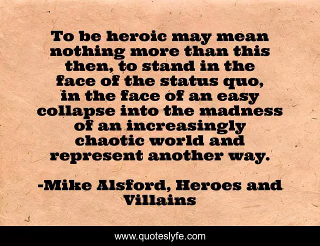 This page presents the quote "To be heroic may mean nothing more than this then, to stand in the face of the status quo, in the face of an easy collapse into the madness of an increasingly chaotic world and represent another way.". Author of this quote is Mike Alsford, Heroes and Villains. .