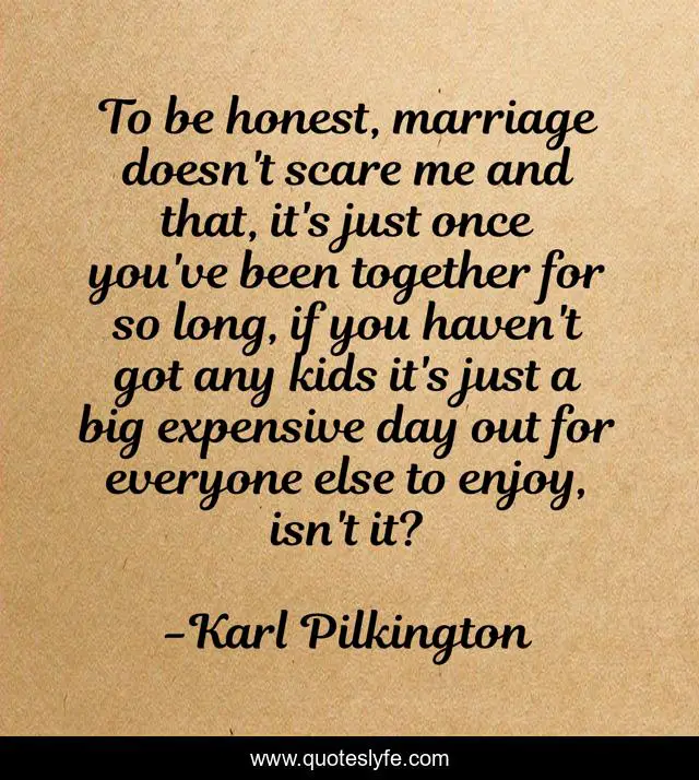This page presents the quote "To be honest, marriage doesn't scare me and that, it's just once you've been together for so long, if you haven't got any kids it's just a big expensive day out for everyone else to enjoy, isn't it?". Author of this quote is Karl Pilkington. This quote is about me, day, together,.
