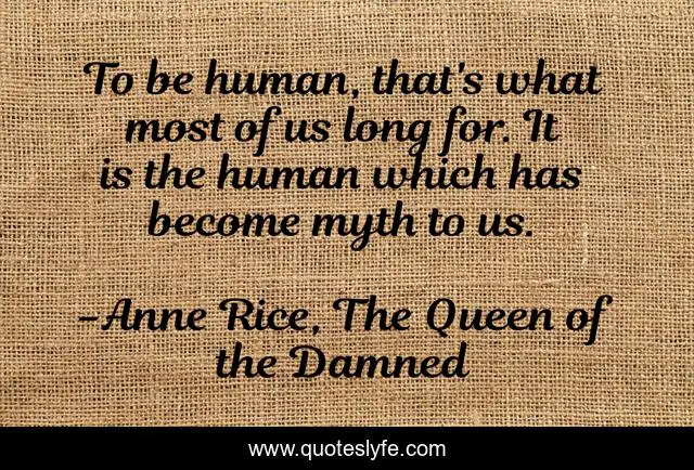 This page presents the quote "To be human, that's what most of us long for. It is the human which has become myth to us.". Author of this quote is Anne Rice, The Queen of the Damned. This quote is about longing, the-vampire-chronicles, myth, the-queen-of-the-damned, human, anne-rice, vampires,.